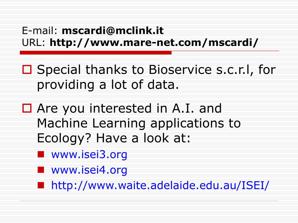 E-mail: mscardi@mclink.itURL: http://www.mare-net.com/mscardi/ • Special thanks to Bioservice s.c.r.l, for providing a lot of data. • Are you interested in A.I. and Machine Learning applications to Ecology? Have a look at: • www.isei3.org • www.isei4.org • http://www.waite.adelaide.edu.au/ISEI/