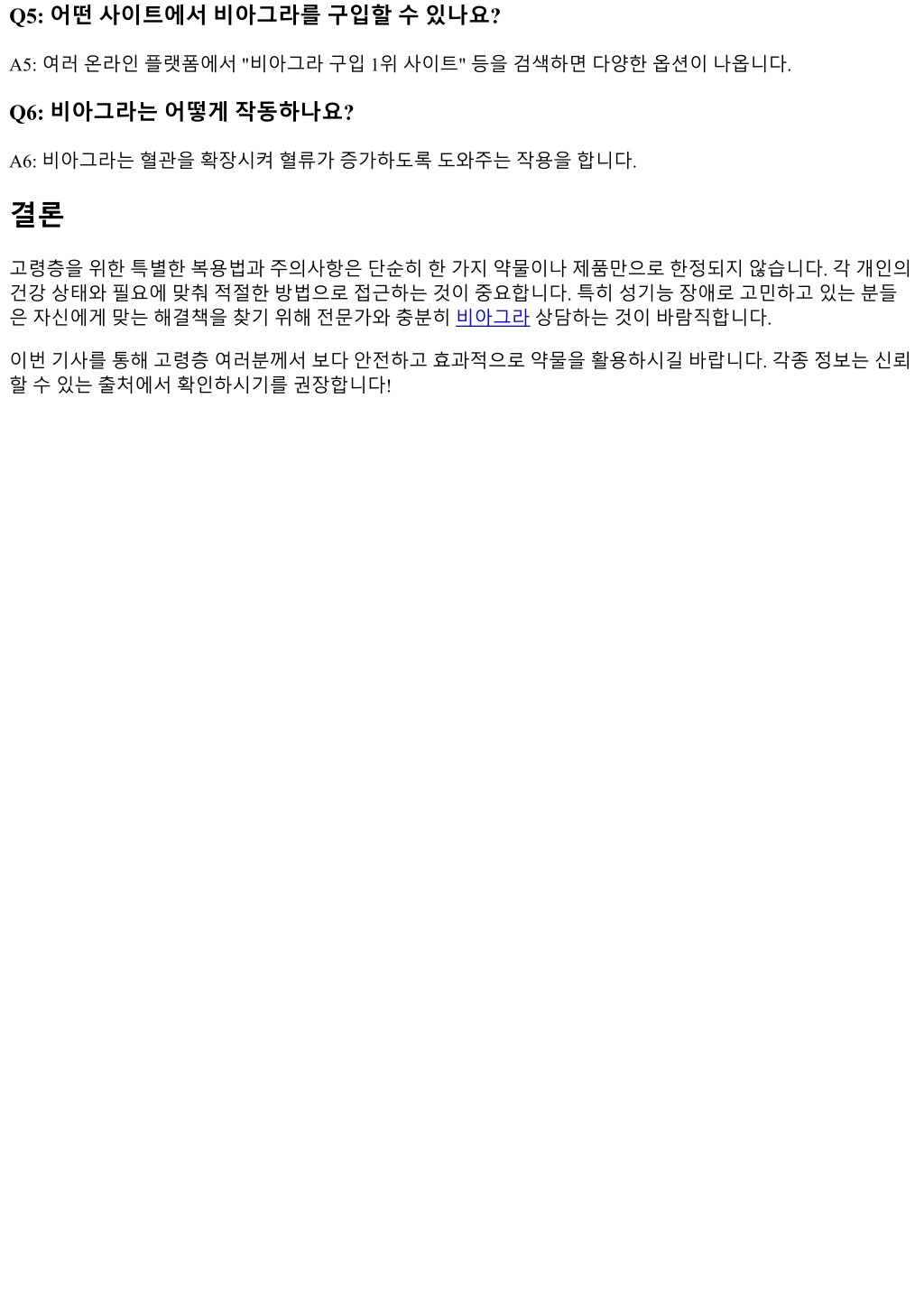 2. Q5: 어떤사이트에서비아그라를구입할수있나요? A5: 여러온라인플랫폼에서 "비아그라구입 1위사이트" 등을검색하면다양한옵션이나옵니다. Q6: 비아그라는어떻게작동하나요? A6: 비아그라는혈관을확장시켜혈류가증가하도록도와주는작용을합니다. 결론 고령층을위한특별한복용법과주의사항은단순히한가지약물이나제품만으로한정되지않습니다. 각개인의 건강상태와필요에맞춰적절한방법으로접근하는것이중요합니다. 특히성기능장애로고민하고있는분들 은자신에게맞는해결책을찾기위해전문가와충분히비아그라상담하는것이바람직합니다. 이번기사를통해고령층여러분께서보다안전하고효과적으로약물을활용하시길바랍니다. 각종정보는신뢰 할수있는출처에서확인하시기를권장합니다!