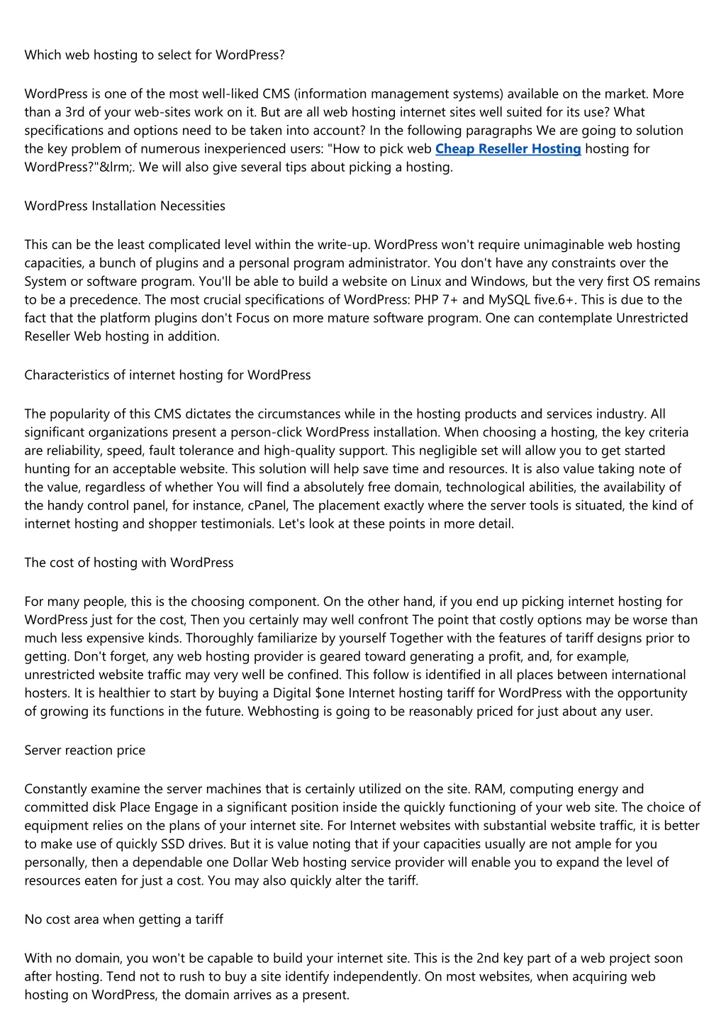 Which web hosting to select for WordPress? WordPress is one of the most well-liked CMS (information management systems) available on the market. More than a 3rd of your web-sites work on it. But are all web hosting internet sites well suited for its use? What specifications and options need to be taken into account? In the following paragraphs We are going to solution the key problem of numerous inexperienced users: "How to pick web Cheap Reseller Hosting hosting for WordPress?"‎. We will also give several tips about picking a hosting. WordPress Installation Necessities This can be the least complicated level within the write-up. WordPress won't require unimaginable web hosting capacities, a bunch of plugins and a personal program administrator. You don't have any constraints over the System or software program. You'll be able to build a website on Linux and Windows, but the very first OS remains to be a precedence. The most crucial specifications of WordPress: PHP 7+ and MySQL five.6+. This is due to the fact that the platform plugins don't Focus on more mature software program. One can contemplate Unrestricted Reseller Web hosting in addition. Characteristics of internet hosting for WordPress The popularity of this CMS dictates the circumstances while in the hosting products and services industry. All significant organizations present a person-click WordPress installation. When choosing a hosting, the key criteria are reliability, speed, fault tolerance and high-quality support. This negligible set will allow you to get started hunting for an acceptable website. This solution will help save time and resources. It is also value taking note of the value, regardless of whether You will find a absolutely free domain, technological abilities, the availability of the handy control panel, for instance, cPanel, The placement exactly where the server tools is situated, the kind of internet hosting and shopper testimonials. Let's look at these points in more detail. The cost of hosting with WordPress For many people, this is the choosing component. On the other hand, if you end up picking internet hosting for WordPress just for the cost, Then you certainly may well confront The point that costly options may be worse than much less expensive kinds. Thoroughly familiarize by yourself Together with the features of tariff designs prior to getting. Don't forget, any web hosting provider is geared toward generating a profit, and, for example, unrestricted website traffic may very well be confined. This follow is identified in all places between international hosters. It is healthier to start by buying a Digital $one Internet hosting tariff for WordPress with the opportunity of growing its functions in the future. Webhosting is going to be reasonably priced for just about any user. Server reaction price Constantly examine the server machines that is certainly utilized on the site. RAM, computing energy and committed disk Place Engage in a significant position inside the quickly functioning of your web site. The choice of equipment relies on the plans of your internet site. For Internet websites with substantial website traffic, it is better to make use of quickly SSD drives. But it is value noting that if your capacities usually are not ample for you personally, then a dependable one Dollar Web hosting service provider will enable you to expand the level of resources eaten for just a cost. You may also quickly alter the tariff. No cost area when getting a tariff With no domain, you won't be capable to build your internet site. This is the 2nd key part of a web project soon after hosting. Tend not to rush to buy a site identify independently. On most websites, when acquiring web hosting on WordPress, the domain arrives as a present.