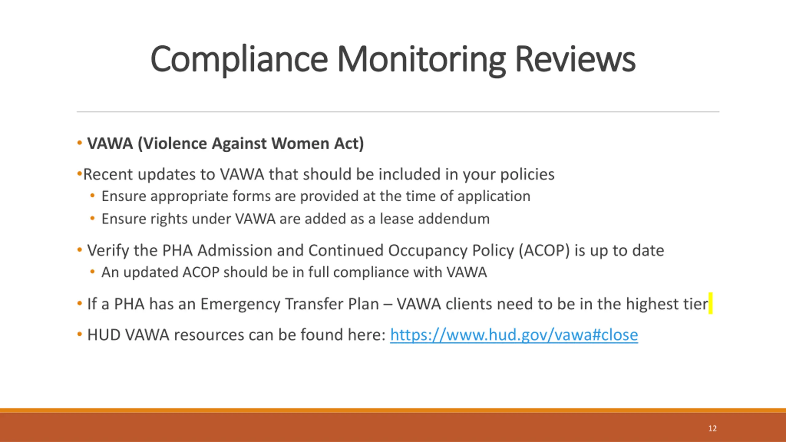 12. Compliance Monitoring Reviews Compliance Monitoring Reviews • VAWA (Violence Against Women Act) •Recent updates to VAWA that should be included in your policies • Ensure appropriate forms are provided at the time of application • Ensure rights under VAWA are added as a lease addendum • Verify the PHA Admission and Continued Occupancy Policy (ACOP) is up to date • An updated ACOP should be in full compliance with VAWA • If a PHA has an Emergency Transfer Plan – VAWA clients need to be in the highest tier • HUD VAWA resources can be found here: https://www.hud.gov/vawa#close 12