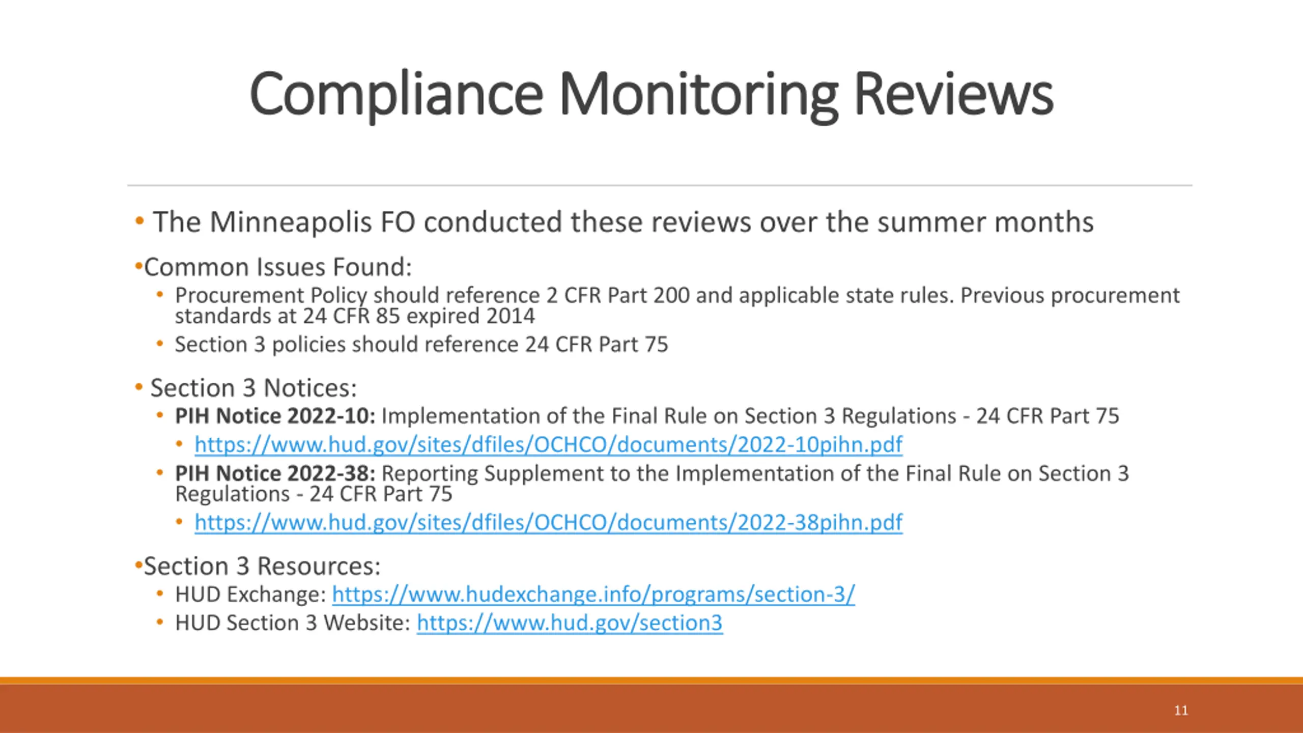 11. Compliance Monitoring Reviews Compliance Monitoring Reviews • The Minneapolis FO conducted these reviews over the summer months •Common Issues Found: • Procurement Policy should reference 2 CFR Part 200 and applicable state rules. Previous procurement standards at 24 CFR 85 expired 2014 • Section 3 policies should reference 24 CFR Part 75 • Section 3 Notices: • PIH Notice 2022-10: Implementation of the Final Rule on Section 3 Regulations - 24 CFR Part 75 • https://www.hud.gov/sites/dfiles/OCHCO/documents/2022-10pihn.pdf • PIH Notice 2022-38: Reporting Supplement to the Implementation of the Final Rule on Section 3 Regulations - 24 CFR Part 75 • https://www.hud.gov/sites/dfiles/OCHCO/documents/2022-38pihn.pdf •Section 3 Resources: • HUD Exchange: https://www.hudexchange.info/programs/section-3/ • HUD Section 3 Website: https://www.hud.gov/section3 11