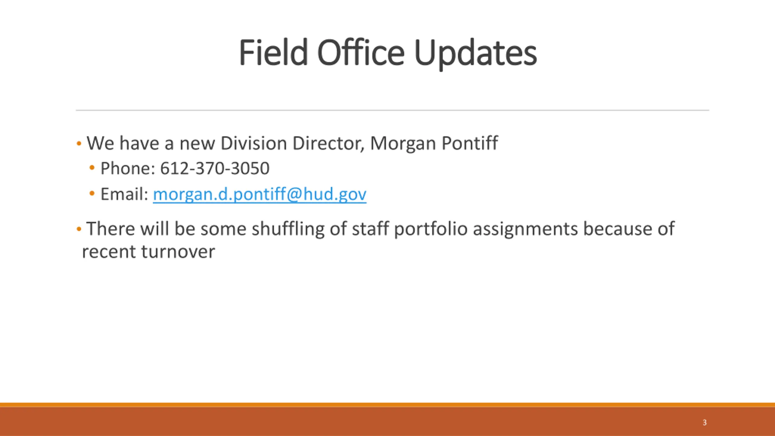 3. Field Office Updates Field Office Updates •We have a new Division Director, Morgan Pontiff • Phone: 612-370-3050 • Email: morgan.d.pontiff@hud.gov •There will be some shuffling of staff portfolio assignments because of recent turnover 3
