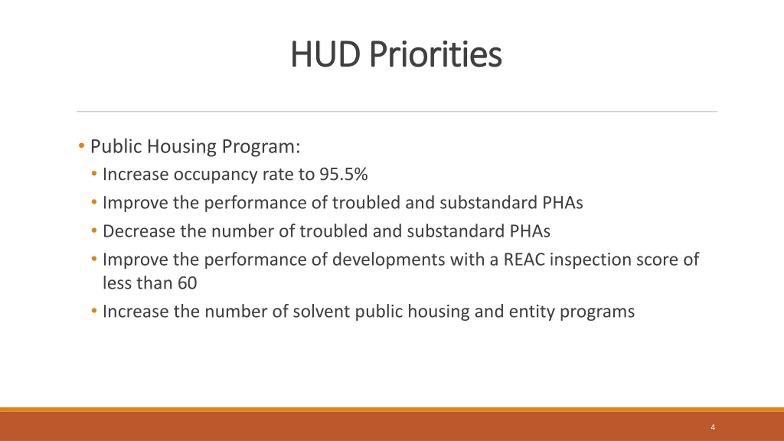 4. HUD Priorities HUD Priorities • Public Housing Program: • Increase occupancy rate to 95.5% • Improve the performance of troubled and substandard PHAs • Decrease the number of troubled and substandard PHAs • Improve the performance of developments with a REAC inspection score of less than 60 • Increase the number of solvent public housing and entity programs 4