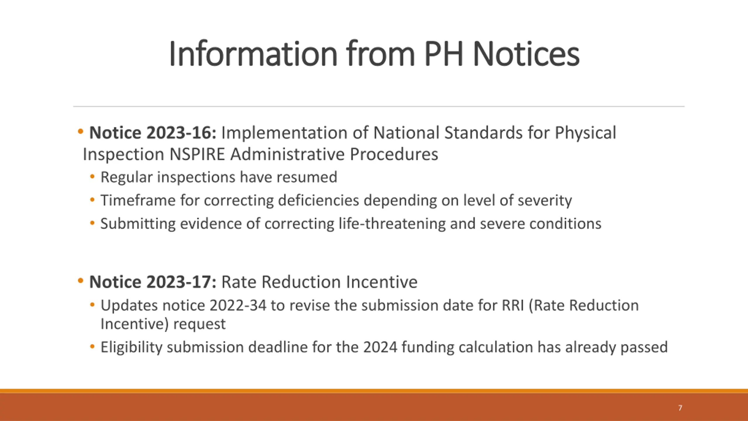 7. Information from PH Notices Information from PH Notices • Notice 2023-16: Implementation of National Standards for Physical Inspection NSPIRE Administrative Procedures • Regular inspections have resumed • Timeframe for correcting deficiencies depending on level of severity • Submitting evidence of correcting life-threatening and severe conditions • Notice 2023-17: Rate Reduction Incentive • Updates notice 2022-34 to revise the submission date for RRI (Rate Reduction Incentive) request • Eligibility submission deadline for the 2024 funding calculation has already passed 7