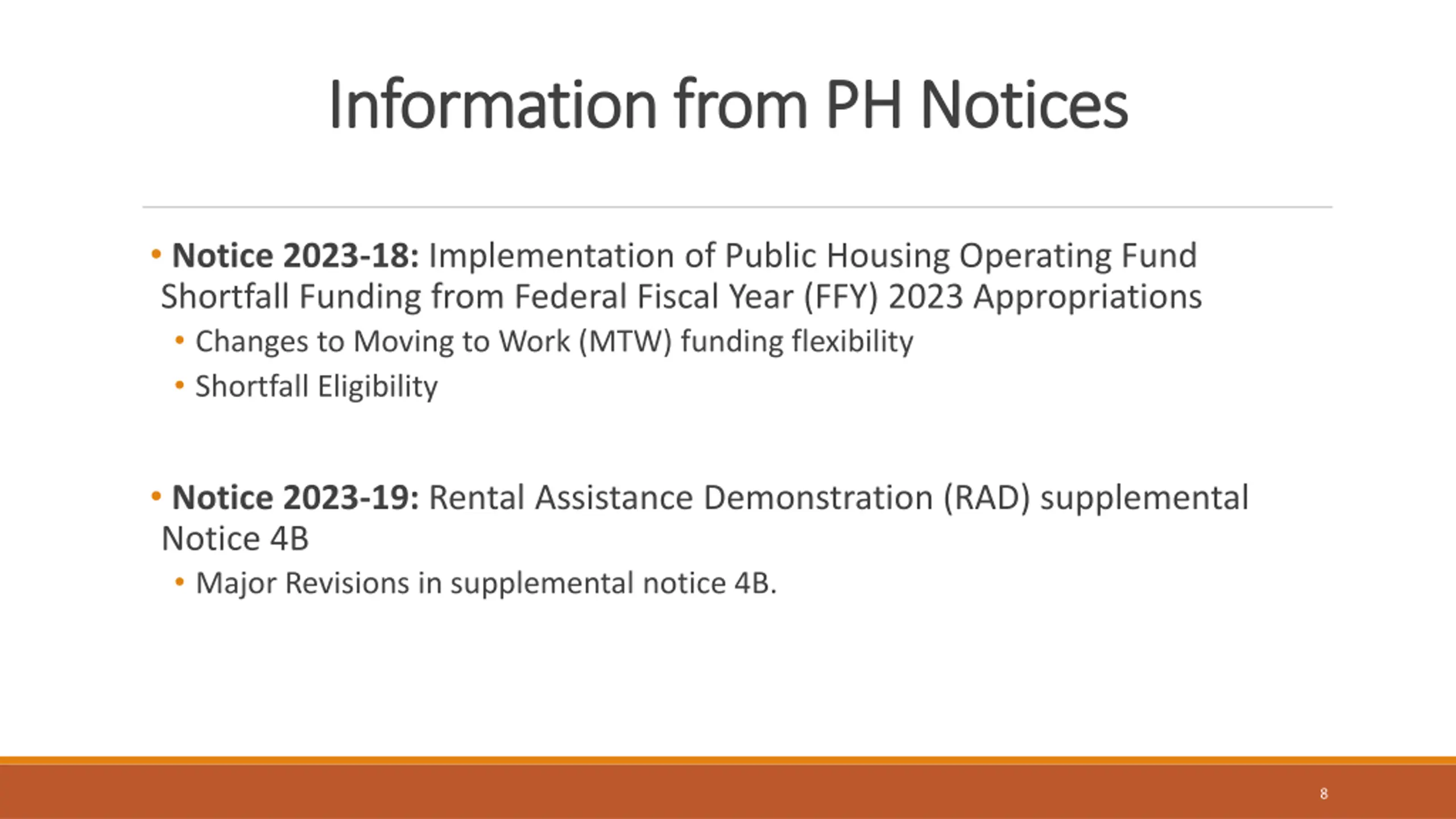 8. Information from PH Notices Information from PH Notices • Notice 2023-18: Implementation of Public Housing Operating Fund Shortfall Funding from Federal Fiscal Year (FFY) 2023 Appropriations • Changes to Moving to Work (MTW) funding flexibility • Shortfall Eligibility • Notice 2023-19: Rental Assistance Demonstration (RAD) supplemental Notice 4B • Major Revisions in supplemental notice 4B. 8