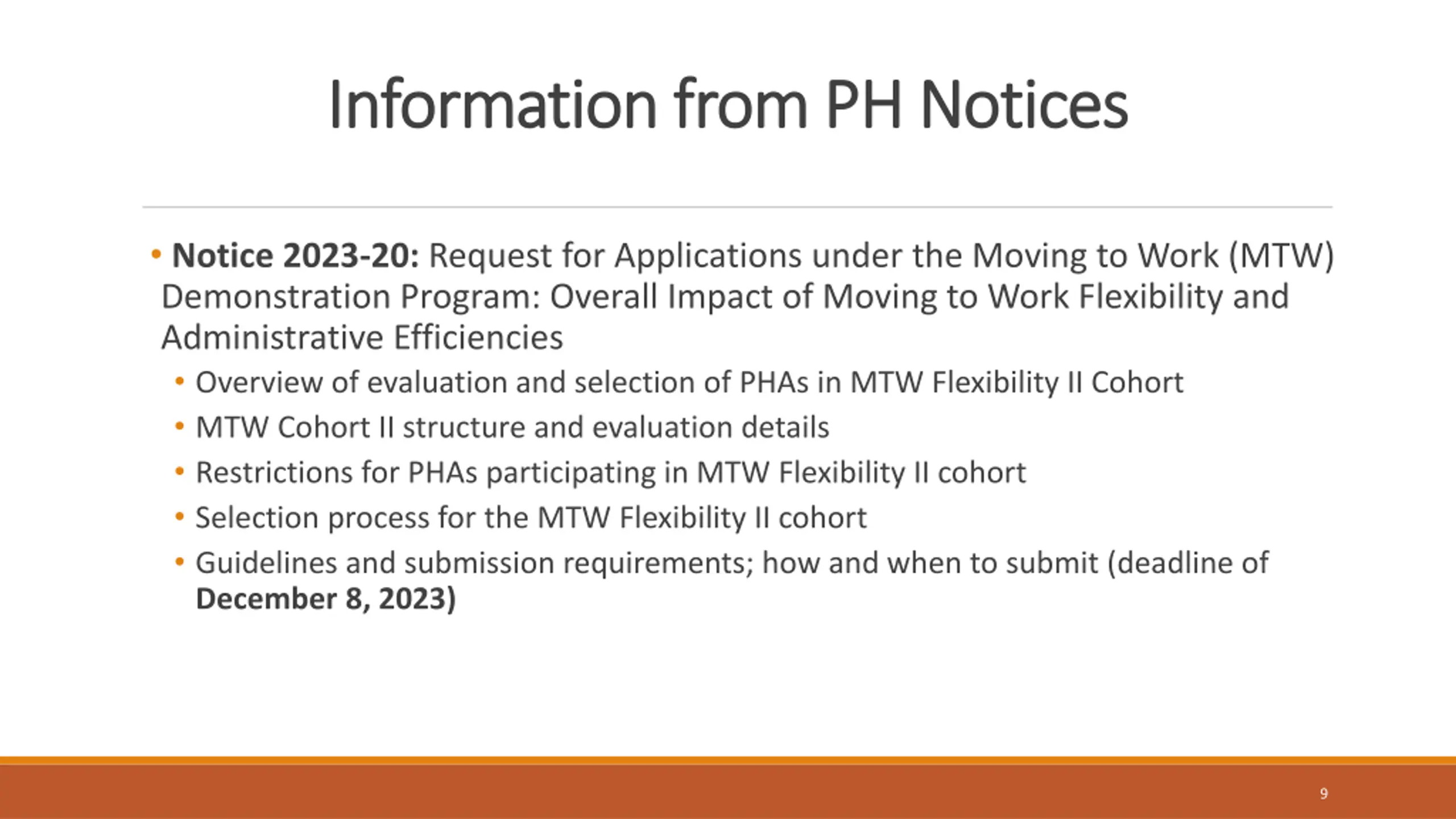 9. Information from PH Notices Information from PH Notices • Notice 2023-20: Request for Applications under the Moving to Work (MTW) Demonstration Program: Overall Impact of Moving to Work Flexibility and Administrative Efficiencies • Overview of evaluation and selection of PHAs in MTW Flexibility II Cohort • MTW Cohort II structure and evaluation details • Restrictions for PHAs participating in MTW Flexibility II cohort • Selection process for the MTW Flexibility II cohort • Guidelines and submission requirements; how and when to submit (deadline of December 8, 2023) 9