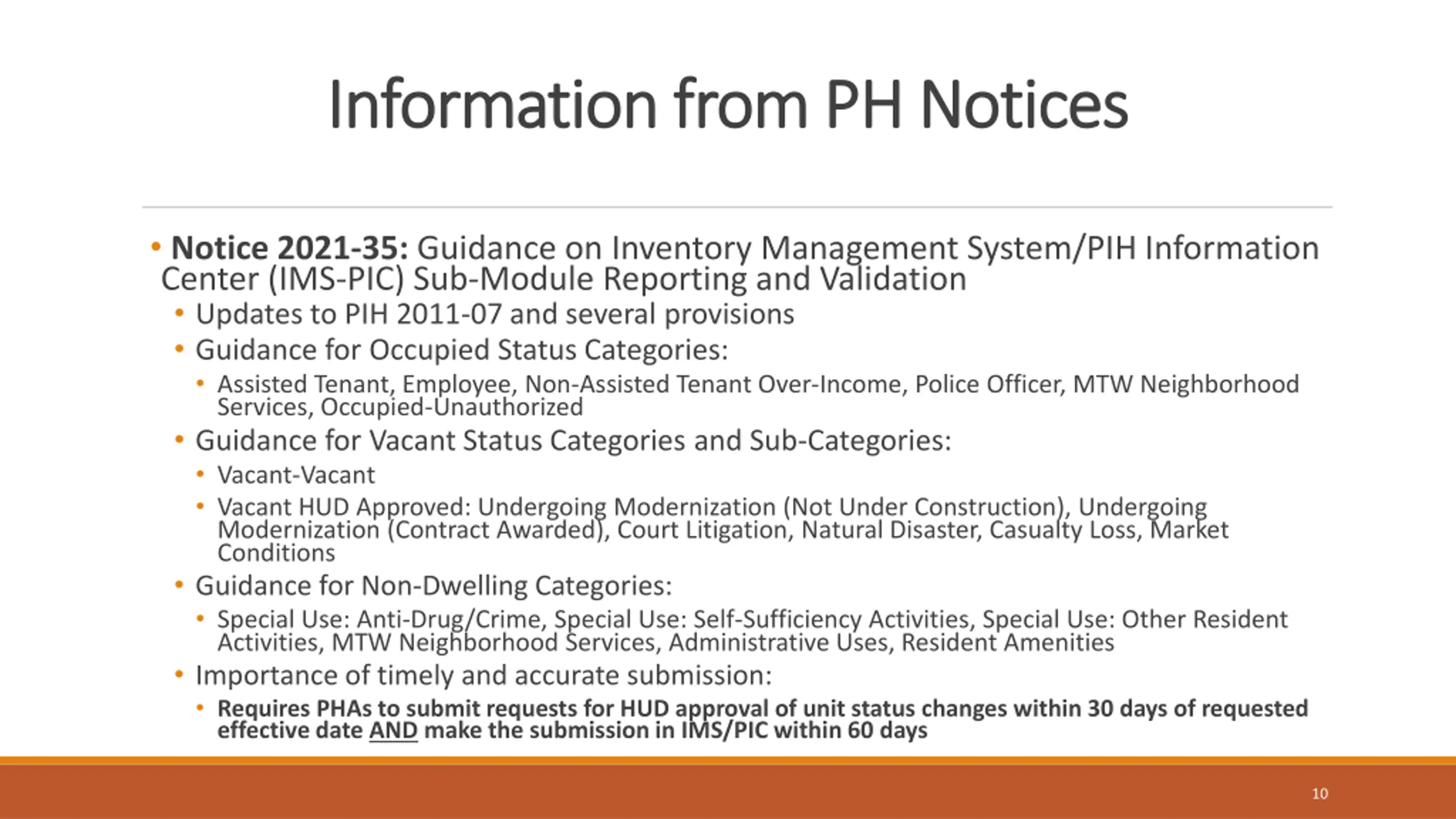 10. Information from PH Notices Information from PH Notices • Notice 2021-35: Guidance on Inventory Management System/PIH Information Center (IMS-PIC) Sub-Module Reporting and Validation • Updates to PIH 2011-07 and several provisions • Guidance for Occupied Status Categories: • Assisted Tenant, Employee, Non-Assisted Tenant Over-Income, Police Officer, MTW Neighborhood Services, Occupied-Unauthorized • Guidance for Vacant Status Categories and Sub-Categories: • Vacant-Vacant • Vacant HUD Approved: Undergoing Modernization (Not Under Construction), Undergoing Modernization (Contract Awarded), Court Litigation, Natural Disaster, Casualty Loss, Market Conditions • Guidance for Non-Dwelling Categories: • Special Use: Anti-Drug/Crime, Special Use: Self-Sufficiency Activities, Special Use: Other Resident Activities, MTW Neighborhood Services, Administrative Uses, Resident Amenities • Importance of timely and accurate submission: • Requires PHAs to submit requests for HUD approval of unit status changes within 30 days of requested effective date AND make the submission in IMS/PIC within 60 days 10