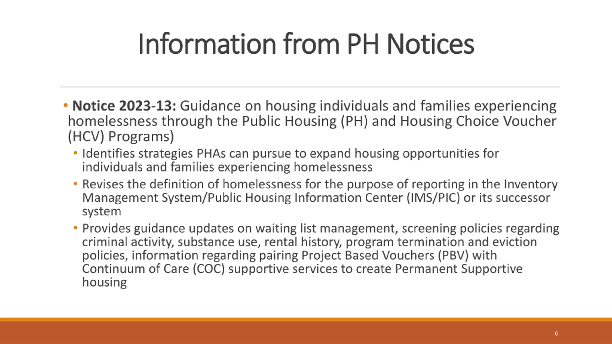6. Information from PH Notices Information from PH Notices • Notice 2023-13: Guidance on housing individuals and families experiencing homelessness through the Public Housing (PH) and Housing Choice Voucher (HCV) Programs) • Identifies strategies PHAs can pursue to expand housing opportunities for individuals and families experiencing homelessness • Revises the definition of homelessness for the purpose of reporting in the Inventory Management System/Public Housing Information Center (IMS/PIC) or its successor system • Provides guidance updates on waiting list management, screening policies regarding criminal activity, substance use, rental history, program termination and eviction policies, information regarding pairing Project Based Vouchers (PBV) with Continuum of Care (COC) supportive services to create Permanent Supportive housing 6