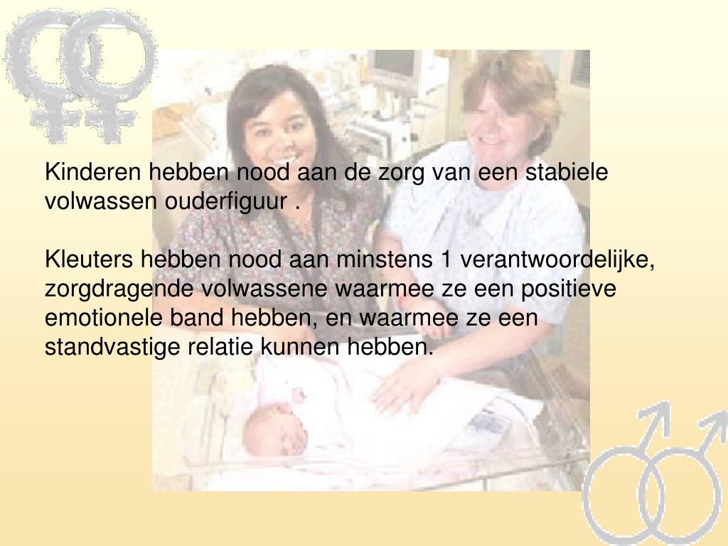 Kinderen hebben nood aan de zorg van een stabiele volwassen ouderfiguur . Kleuters hebben nood aan minstens 1 verantwoordelijke, zorgdragende volwassene waarmee ze een positieve emotionele band hebben, en waarmee ze een standvastige relatie kunnen hebben.
