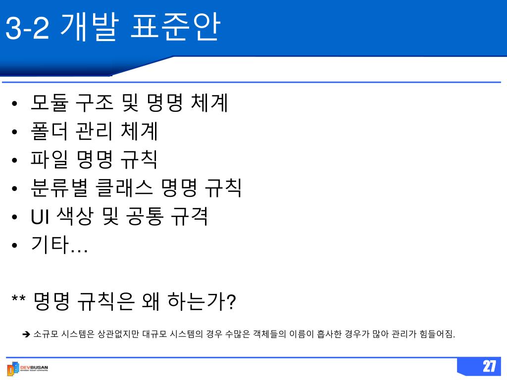 3-2 개발 표준안 • 모듈 구조 및 명명 체계 • 폴더 관리 체계 • 파일 명명 규칙 • 분류별 클래스 명명 규칙 • UI 색상 및 공통 규격 • 기타… ** 명명 규칙은 왜 하는가? 소규모 시스템은 상관없지만 대규모 시스템의 경우 수많은 객체들의 이름이 흡사한 경우가 많아 관리가 힘들어짐.