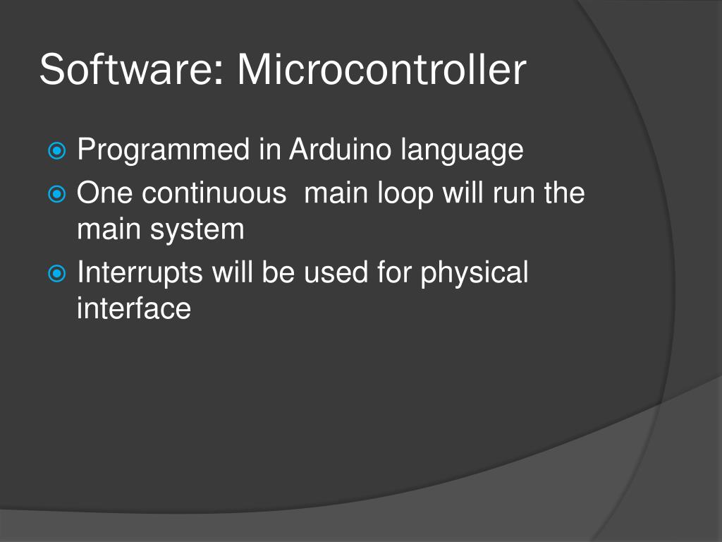 Software: Microcontroller • Programmed in Arduino language • One continuous main loop will run the main system • Interrupts will be used for physical interface