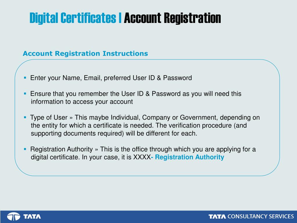 Digital Certificates |Account Registration Account Registration Instructions • Enter your Name, Email, preferred User ID & Password • Ensure that you remember the User ID & Password as you will need this information to access your account • Type of User » This maybe Individual, Company or Government, depending on the entity for which a certificate is needed. The verification procedure (and supporting documents required) will be different for each. • Registration Authority » This is the office through which you are applying for a digital certificate. In your case, it is XXXX- Registration Authority