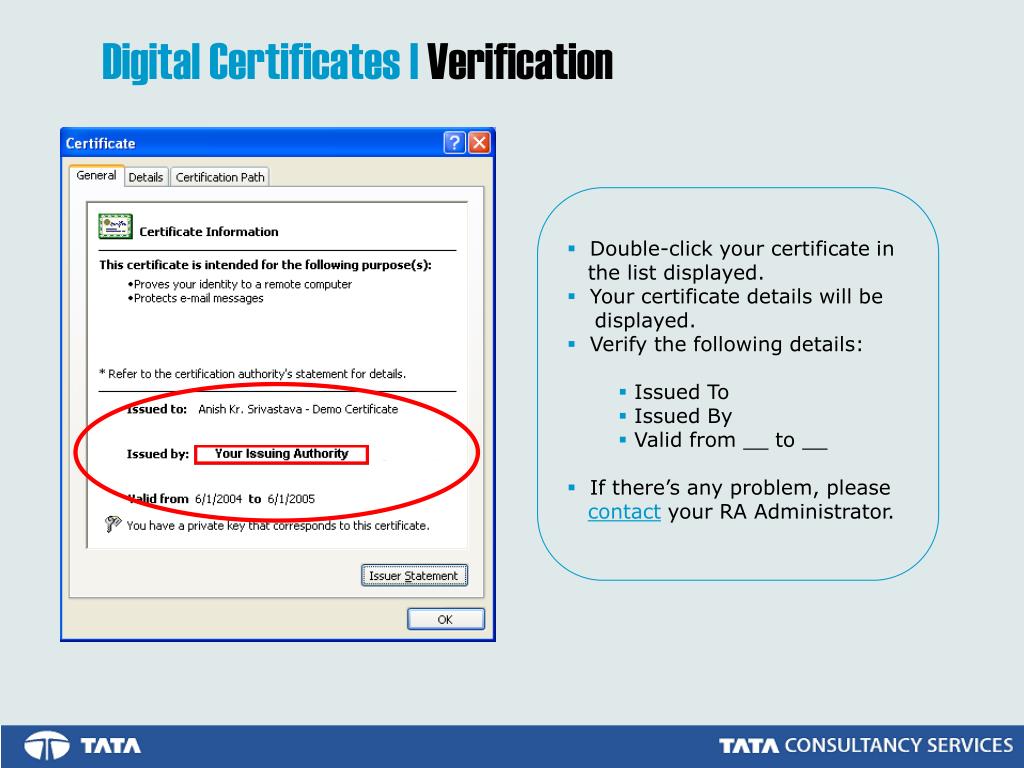 Digital Certificates | Verification • Double-click your certificate in the list displayed. • Your certificate details will be displayed. • Verify the following details: • Issued To • Issued By • Valid from __ to __ • If there’s any problem, please contact your RA Administrator.