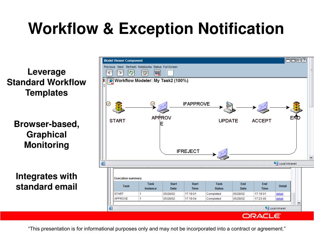 Workflow & Exception Notification LeverageStandard Workflow Templates Browser-based, Graphical Monitoring Integrates with standard email