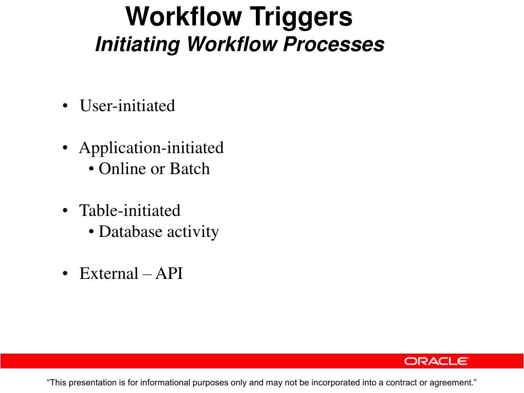 Workflow TriggersInitiating Workflow Processes • User-initiated • Application-initiated • Online or Batch • Table-initiated • Database activity • External – API