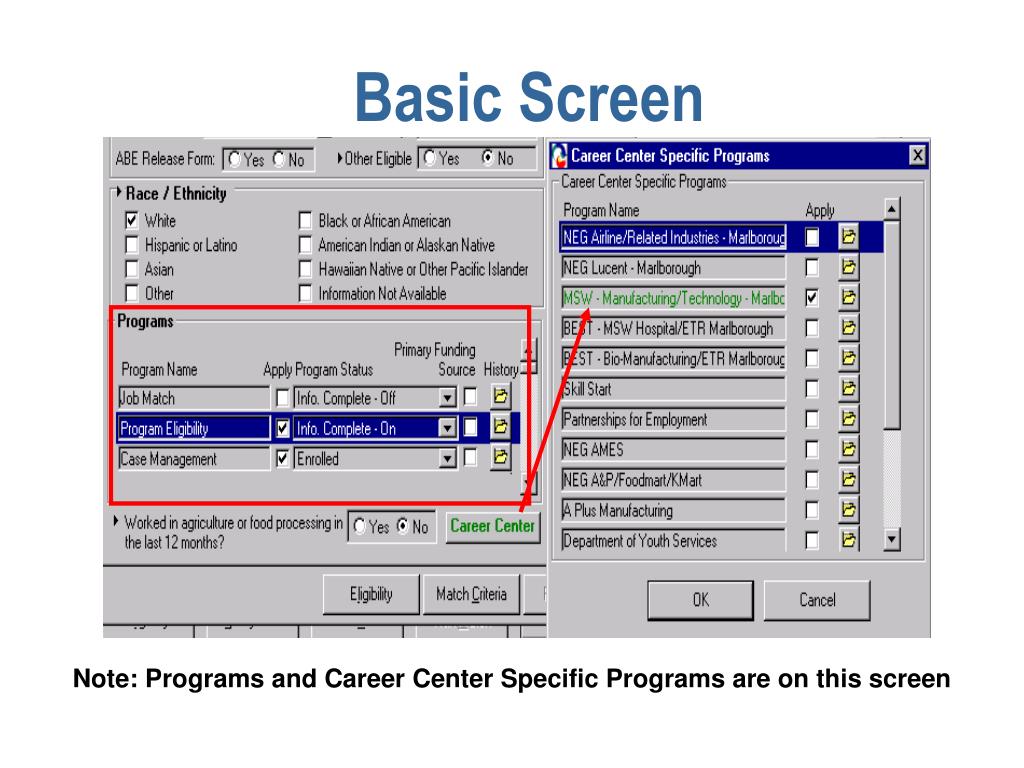 Basic Screen Note: Programs and Career Center Specific Programs are on this screen