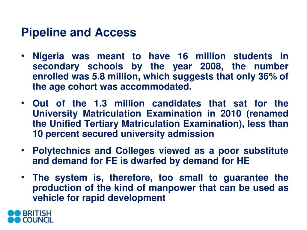 Pipeline and Access • Nigeria was meant to have 16 million students in secondary schools by the year 2008, the number enrolled was 5.8 million, which suggests that only 36% of the age cohort was accommodated. • Out of the 1.3 million candidates that sat for the University Matriculation Examination in 2010 (renamed the Unified Tertiary Matriculation Examination), less than 10 percent secured university admission • Polytechnics and Colleges viewed as a poor substitute and demand for FE is dwarfed by demand for HE • The system is, therefore, too small to guarantee the production of the kind of manpower that can be used as vehicle for rapid development