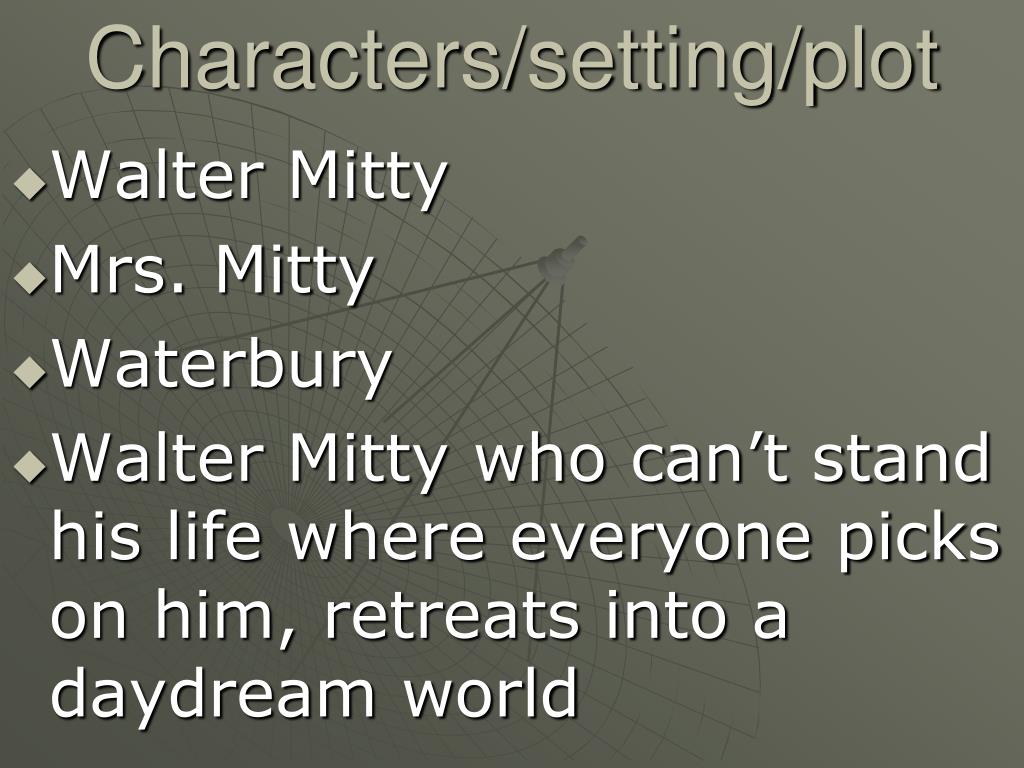 Characters/setting/plot • Walter Mitty • Mrs. Mitty • Waterbury • Walter Mitty who can’t stand his life where everyone picks on him, retreats into a daydream world