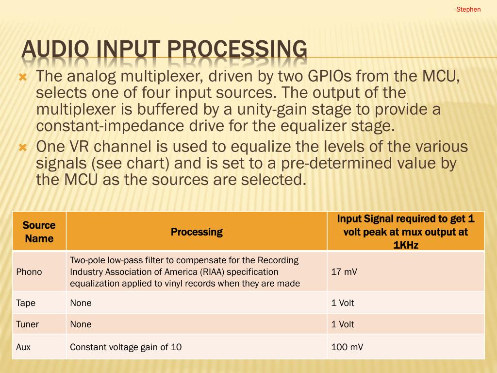 Stephen • Op-amps: • The Texas Instruments’ LM4562 • Analog Multiplexer: • The Analog Devices’ ADG408 AUDIO INPUT DESIGN DECISIONS The ADG408BN was chosen due to excellent crosstalk, compatibility with the power supply voltages and performance during simulation