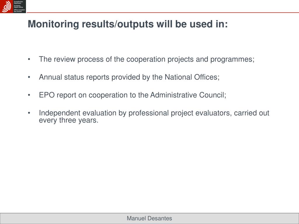 Monitoring results/outputs will be used in: • The review process of the cooperation projects and programmes; • Annual status reports provided by the National Offices; • EPO report on cooperation to the Administrative Council; • Independent evaluation by professional project evaluators, carried out every three years. Manuel Desantes