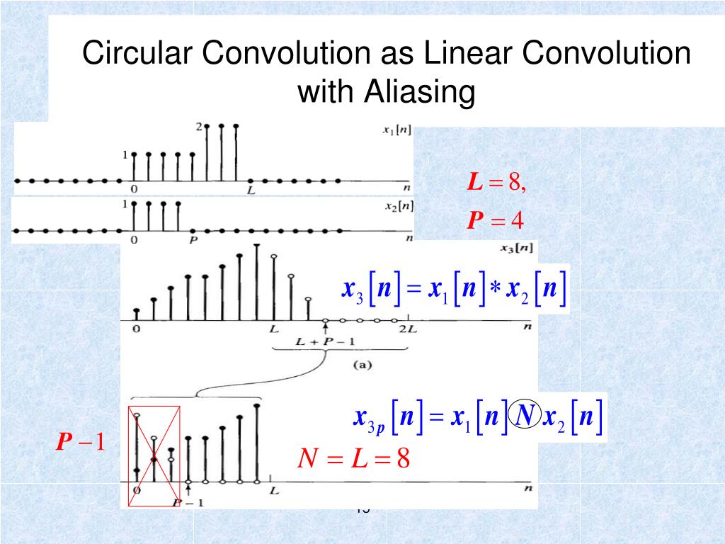 (3)calculate (1)Segment into sections of length L; (2) fill 0 into and some section of , then do L+P-1 points FFT ; overlap-add method L=16 P-1 points (4)add the points n=0…P-2 in yr[n]to the last P-1 points in the former section yr-1[n],the output for this section is the points n=0…L-1