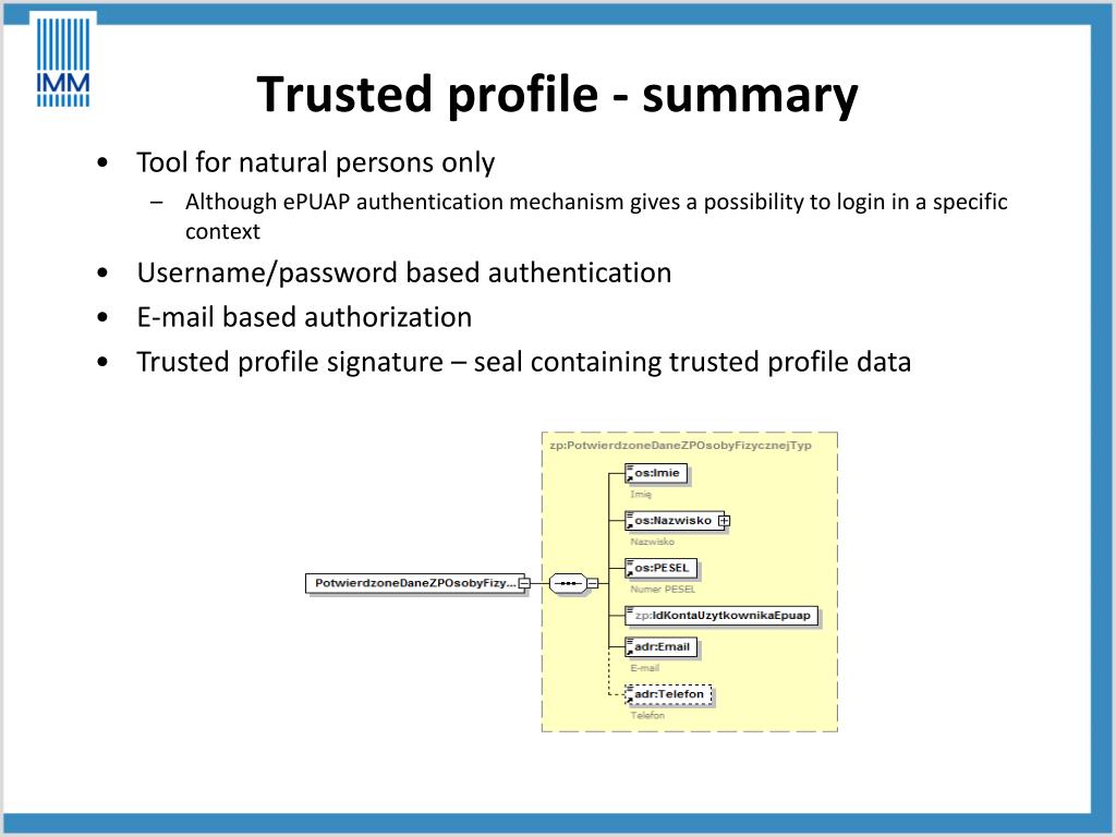 Trusted profile - summary • Tool for naturalpersonsonly • Although ePUAP authenticationmechanismgives a possibility to login in a specificcontext • Username/passwordbasedauthentication • E-mail basedauthorization • Trusted profile signature – sealcontainingtrusted profile data
