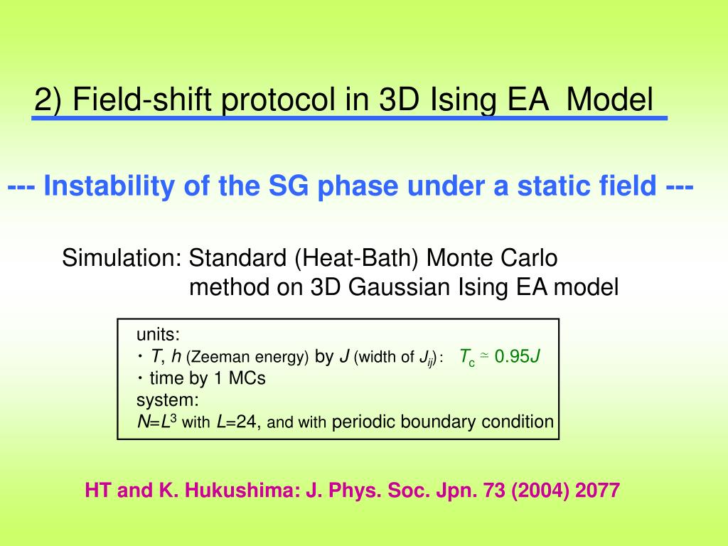 Outline • Introduction (previous slide) 2. Field-shift aging protocol in 3D Ising EA model --- Instability of the SG phase in a static magnetic field --- K. Hukushima (U. Tokyo) HT and KH: J. Phys. Soc. Jpn. 73 (2004) 2077. 3. Field-cooled magnetization in a small field P. E. Jönsson (now in RIKEN) PEJand HT: J. Phys. Soc. Jpn. 74 (2005) 1131. 4. Conclusion