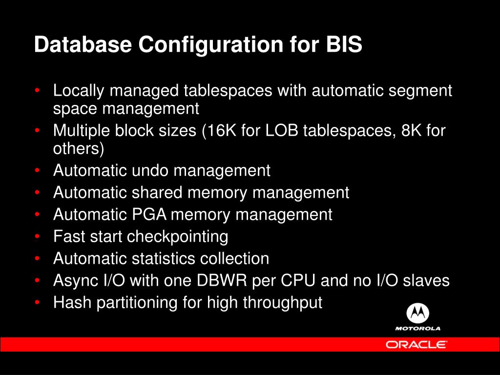 10g Features Critical to BIS • LOBs: primary data storage technology • Java Stored Procedures: for enhancing the capabilities of Motorola’s workflow engine • Text: for searching inside documents • XDB: for managing XML data • Advanced Replication: for redundancy