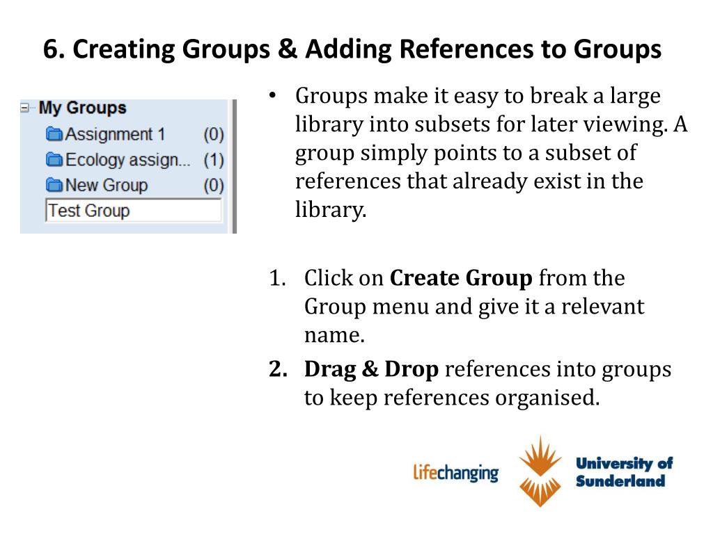 6. Creating Groups & Adding References to Groups • Groups make it easy to break a large library into subsets for later viewing. A group simply points to a subset of references that already exist in the library. • Click on Create Group from the Group menu and give it a relevant name. • Drag & Drop references into groups to keep references organised.