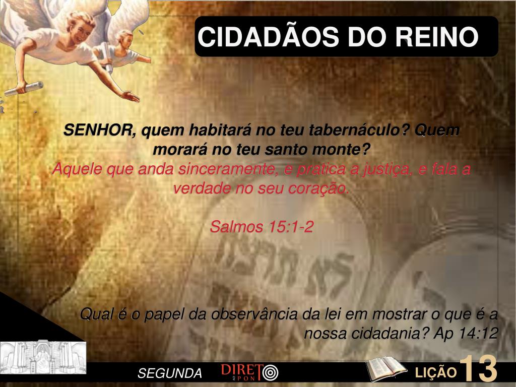 CIDADÃOS DO REINO • SENHOR, quem habitará no teu tabernáculo? Quem morará no teu santo monte? • Aquele que anda sinceramente, e pratica a justiça, e fala a verdade no seu coração. • Salmos 15:1-2 • Qual é o papel da observância da lei em mostrar o que é a nossa cidadania? Ap 14:12 • SEGUNDA