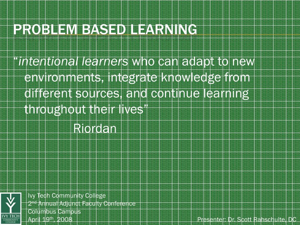 “intentional learners who can adapt to new environments, integrate knowledge from different sources, and continue learning throughout their lives” Riordan Problem Based learning Ivy Tech Community College 2nd Annual Adjunct Faculty Conference Columbus Campus April 19th, 2008 Presenter: Dr. Scott Rahschulte, DC