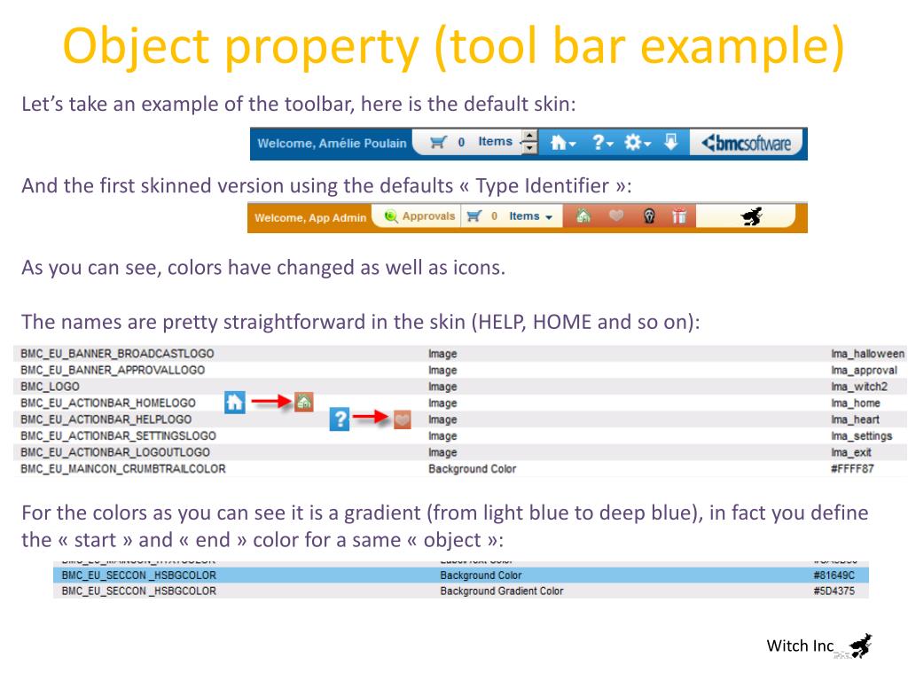 Let’stake an example of the toolbar, hereis the default skin: And the first skinned version using the defaults « Type Identifier »: As youcansee, colors have changed as well as icons. The names are prettystraightforward in the skin (HELP, HOME and so on): For the colorsas youcanseeitis a gradient (from light blue to deepblue), in factyoudefine the « start » and « end » color for a same « object »: Object property (tool bar example) WitchInc