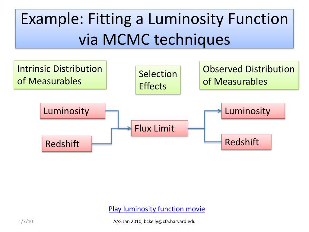 Example: Fitting a Luminosity Function via MCMC techniques Intrinsic Distribution of Measurables Observed Distribution of Measurables Selection Effects Luminosity Luminosity Flux Limit Redshift Redshift Play luminosity function movie AAS Jan 2010, bckelly@cfa.harvard.edu