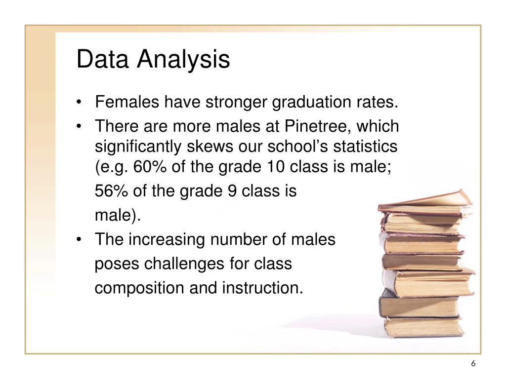 Data Analysis • Females have stronger graduation rates. • There are more males at Pinetree, which significantly skews our school’s statistics (e.g. 60% of the grade 10 class is male; 56% of the grade 9 class is male). • The increasing number of males poses challenges for class composition and instruction.