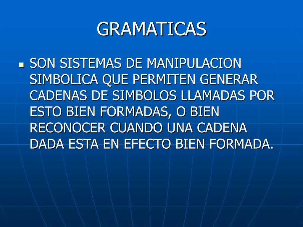GRAMATICAS • SON SISTEMAS DE MANIPULACION SIMBOLICA QUE PERMITEN GENERAR CADENAS DE SIMBOLOS LLAMADAS POR ESTO BIEN FORMADAS, O BIEN RECONOCER CUANDO UNA CADENA DADA ESTA EN EFECTO BIEN FORMADA.