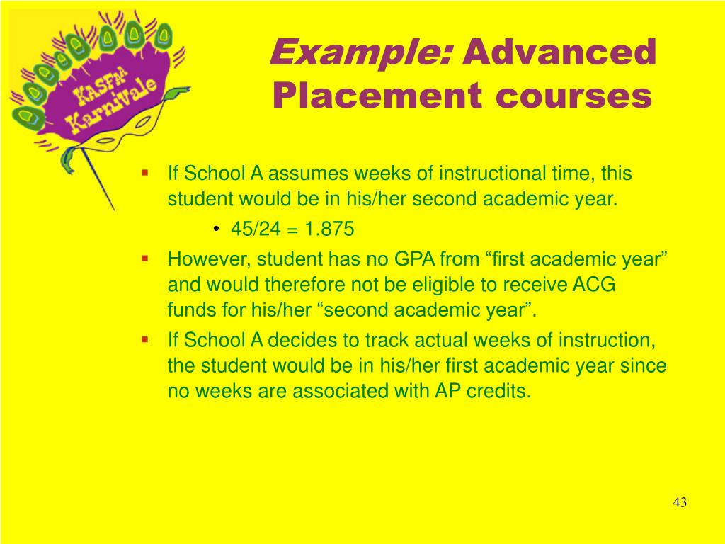 Example: Advanced Placement courses • Student graduated high school May 2006. Enrolls at School A for Fall 2006. Student has 45 AP credits, all with a score of 3 or higher. • School A’s definition of academic year is 24 credit hours and 30 weeks of instructional time.