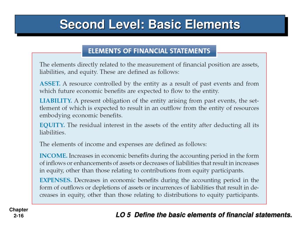 Second Level: Basic Elements LO 5 Define the basic elements of financial statements.