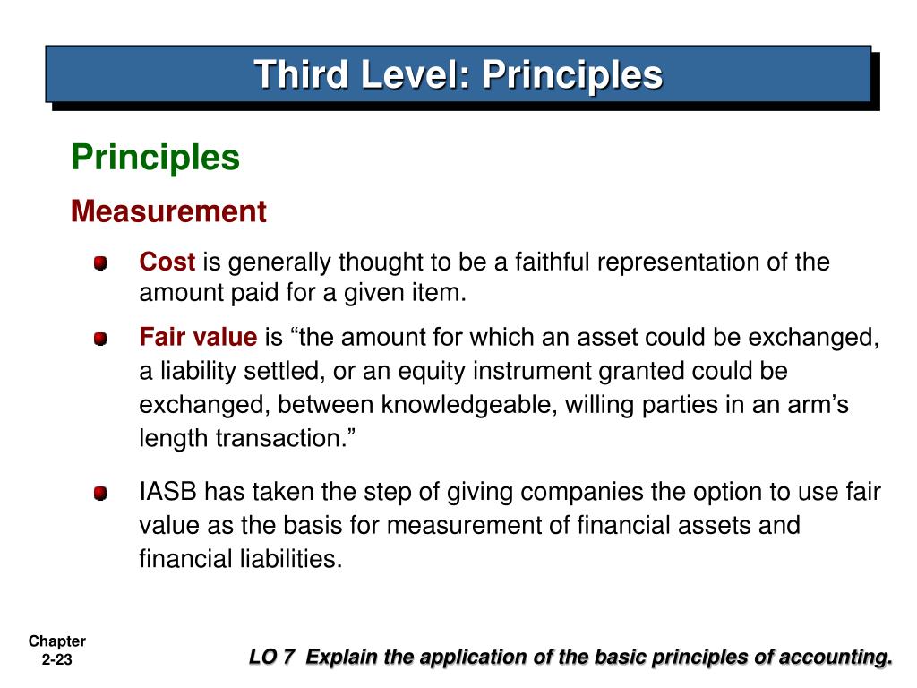 Third Level: Principles Principles • Measurement • Cost is generally thought to be a faithful representation of the amount paid for a given item. • Fair value is “the amount for which an asset could be exchanged, a liability settled, or an equity instrument granted could be exchanged, between knowledgeable, willing parties in an arm’s length transaction.” • IASB has taken the step of giving companies the option to use fair value as the basis for measurement of financial assets and financial liabilities. LO 7 Explain the application of the basic principles of accounting.