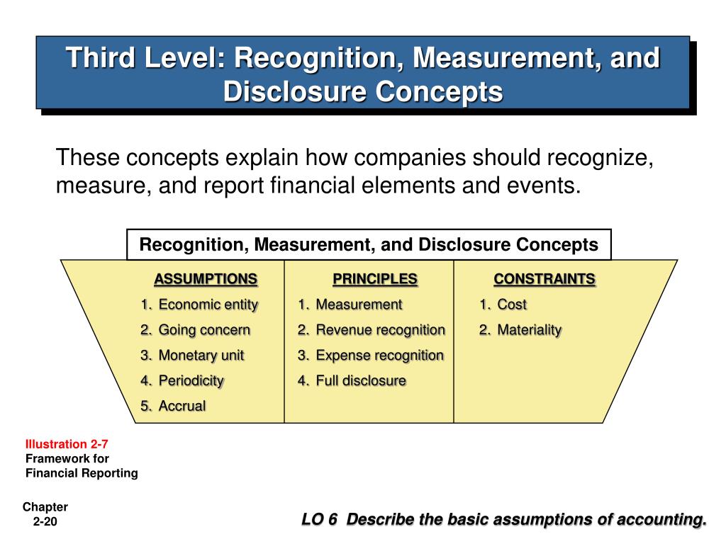 Third Level: Recognition, Measurement, and Disclosure Concepts These concepts explain how companies should recognize, measure, and report financial elements and events. Recognition, Measurement, and Disclosure Concepts • ASSUMPTIONS • Economic entity • Going concern • Monetary unit • Periodicity • Accrual • PRINCIPLES • Measurement • Revenue recognition • Expense recognition • Full disclosure • CONSTRAINTS • Cost • Materiality Illustration 2-7 Framework for Financial Reporting LO 6 Describe the basic assumptions of accounting.