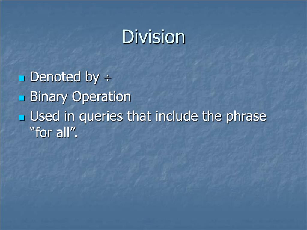 Division • Denoted by • Binary Operation • Used in queries that include the phrase “for all”.