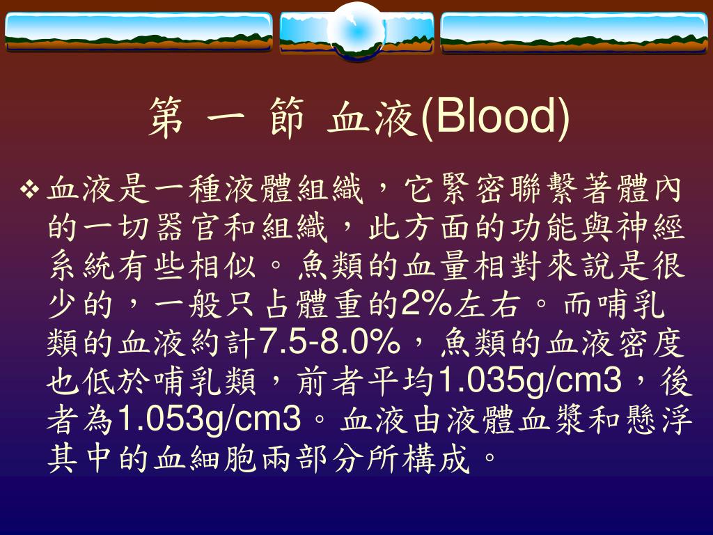 第 一 節 血液(Blood) • 血液是一種液體組織,它緊密聯繫著體內的一切器官和組織,此方面的功能與神經系統有些相似。魚類的血量相對來說是很少的,一般只占體重的2%左右。而哺乳類的血液約計7.5-8.0%,魚類的血液密度也低於哺乳類,前者平均1.035g/cm3,後者為1.053g/cm3。血液由液體血漿和懸浮其中的血細胞兩部分所構成。