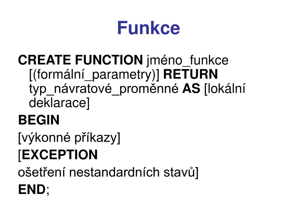 Funkce CREATE FUNCTION jméno_funkce [(formální_parametry)] RETURN typ_návratové_proměnné AS [lokální deklarace] BEGIN [výkonné příkazy] [EXCEPTION ošetření nestandardních stavů] END;