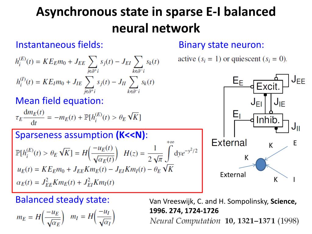 Asynchronous state in sparse E-I balanced neural network Instantaneous fields: Binary state neuron: Mean field equation: Sparseness assumption (K<<N): E K K External K I Balanced steady state: Van Vreeswijk, C. and H. Sompolinsky, Science, 1996. 274, 1724-1726