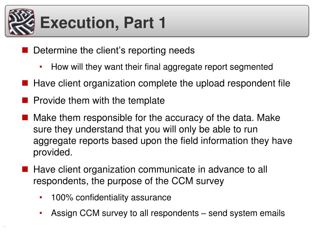 Execution, Part 1 • Determine the client’s reporting needs • How will they want their final aggregate report segmented • Have client organization complete the upload respondent file • Provide them with the template • Make them responsible for the accuracy of the data. Make sure they understand that you will only be able to run aggregate reports based upon the field information they have provided. • Have client organization communicate in advance to all respondents, the purpose of the CCM survey • 100% confidentiality assurance • Assign CCM survey to all respondents – send system emails
