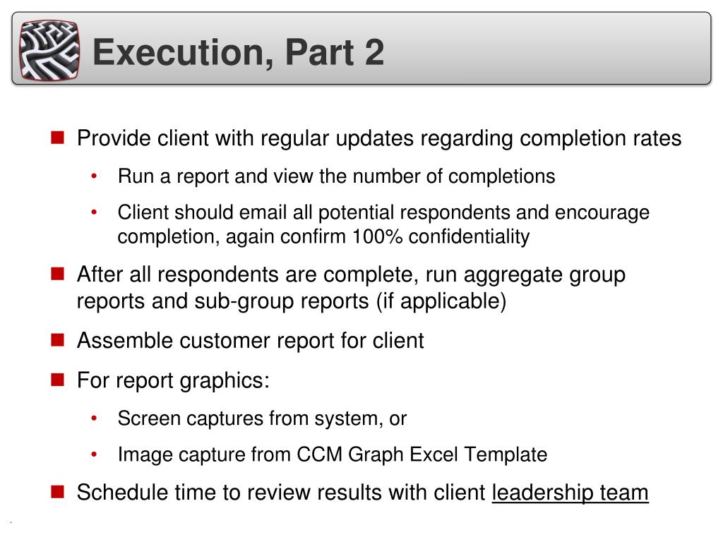 Execution, Part 2 • Provide client with regular updates regarding completion rates • Run a report and view the number of completions • Client should email all potential respondents and encourage completion, again confirm 100% confidentiality • After all respondents are complete, run aggregate group reports and sub-group reports (if applicable) • Assemble customer report for client • For report graphics: • Screen captures from system, or • Image capture from CCM Graph Excel Template • Schedule time to review results with client leadership team