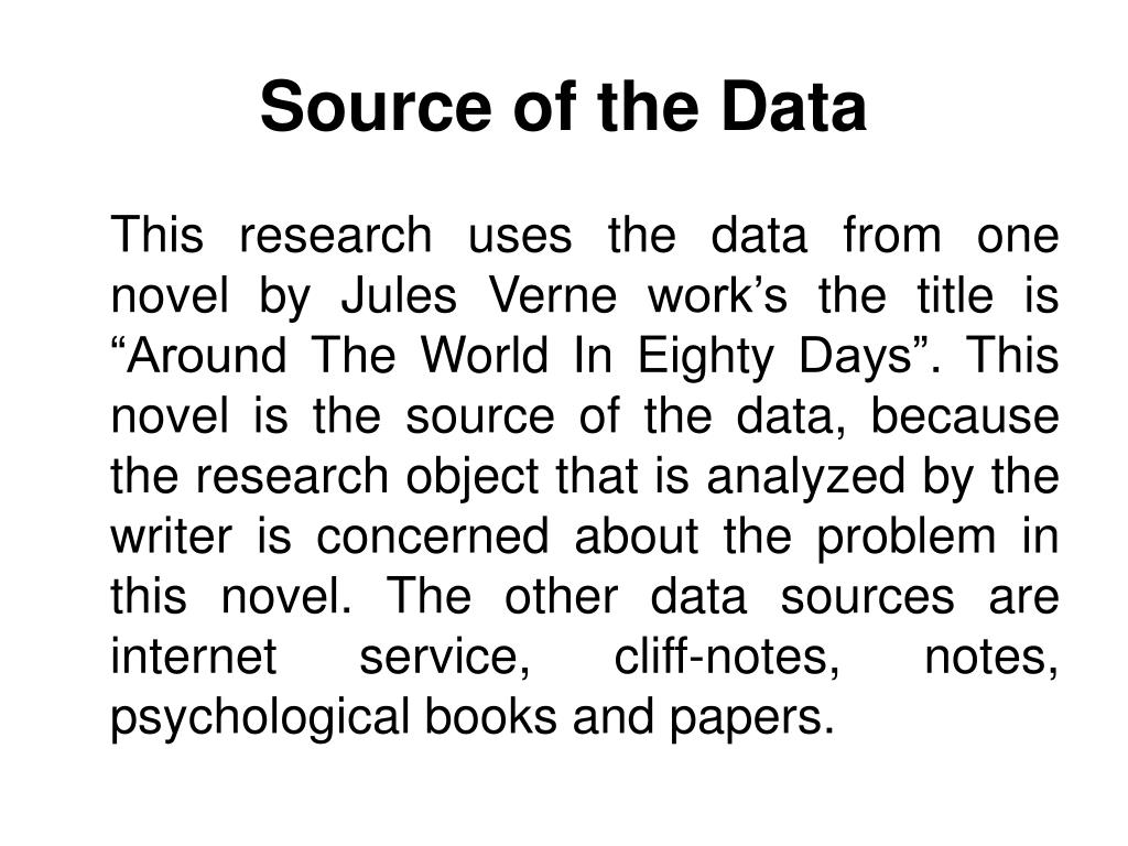 Source of the Data This research uses the data from one novel by Jules Verne work’s the title is “Around The World In Eighty Days”. This novel is the source of the data, because the research object that is analyzed by the writer is concerned about the problem in this novel. The other data sources are internet service, cliff-notes, notes, psychological books and papers.