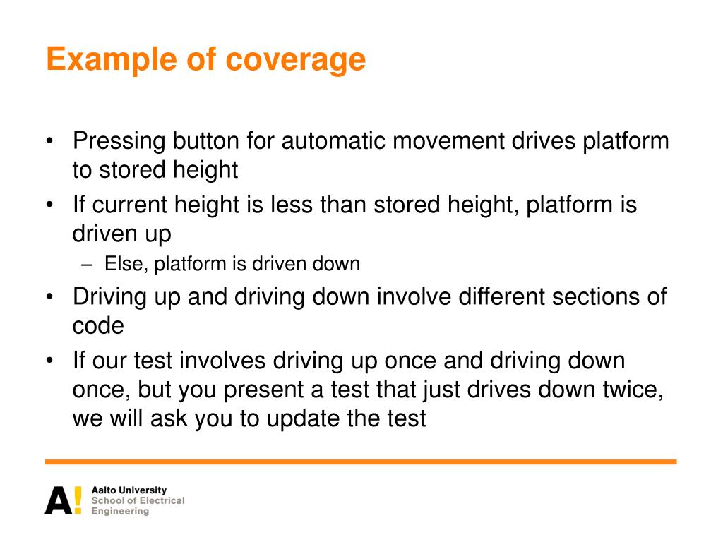 Example of coverage Pressing button for automatic movement drives platform to stored height If current height is less than stored height, platform is driven up • Else, platform is driven down Driving up and driving down involve different sections of code If our test involves driving up once and driving down once, but you present a test that just drives down twice, we will ask you to update the test