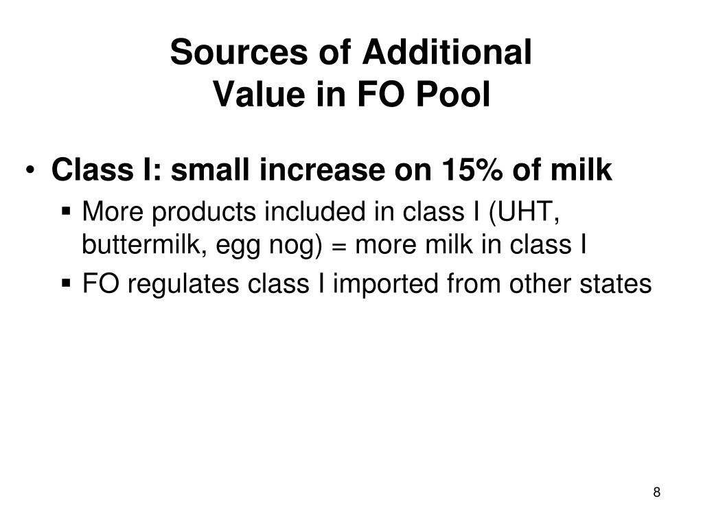 Sources of Additional Value in FO Pool • Class I: small increase on 15% of milk • More products included in class I (UHT, buttermilk, egg nog) = more milk in class I • FO regulates class I imported from other states