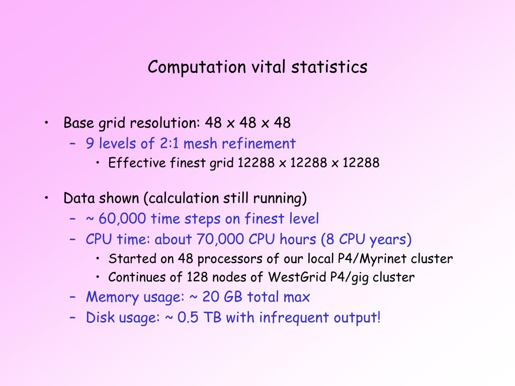 Computation vital statistics • Base grid resolution: 48 x 48 x 48 • 9 levels of 2:1 mesh refinement • Effective finest grid 12288 x 12288 x 12288 • Data shown (calculation still running) • ~ 60,000 time steps on finest level • CPU time: about 70,000 CPU hours (8 CPU years) • Started on 48 processors of our local P4/Myrinet cluster • Continues of 128 nodes of WestGrid P4/gig cluster • Memory usage: ~ 20 GB total max • Disk usage: ~ 0.5 TB with infrequent output!