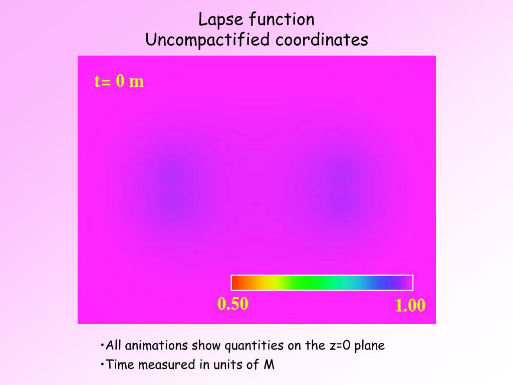 Lapse function Uncompactified coordinates • All animations show quantities on the z=0 plane • Time measured in units of M
